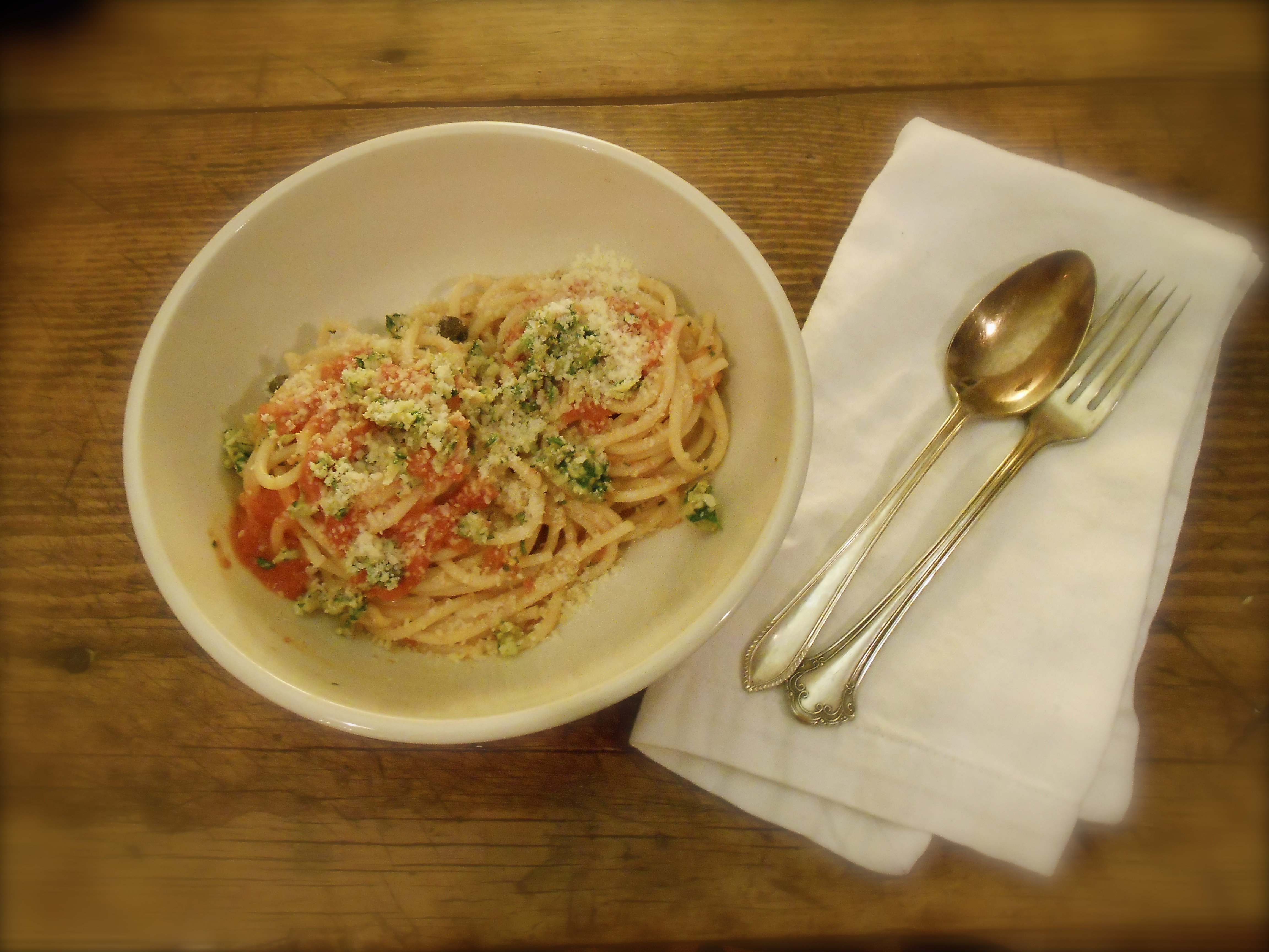 Years ago I had a friend from Vicenza Italy who cooked remarkable spaghetti dinners. Every Sunday for years I was lucky enough to sit at his table. He prepared sauces using unimaginable ingredients. Always surprising. Always delicious. However, as an aspiring cook it was very frustrating for me. He would never allow me to directly observe his cooking! He was very secretive. I would sneak as many peeks as I could. There was always “something missing” when I tried to put together my own sauces at home. I learned to develop my own versions of his creations. Here’s one I love. Spaghetti Puttanesca “the kitchen sink sauce”. Only the tomato sauce is cooked. I think it adds more flavor by keeping the “kitchen sink” uncooked.