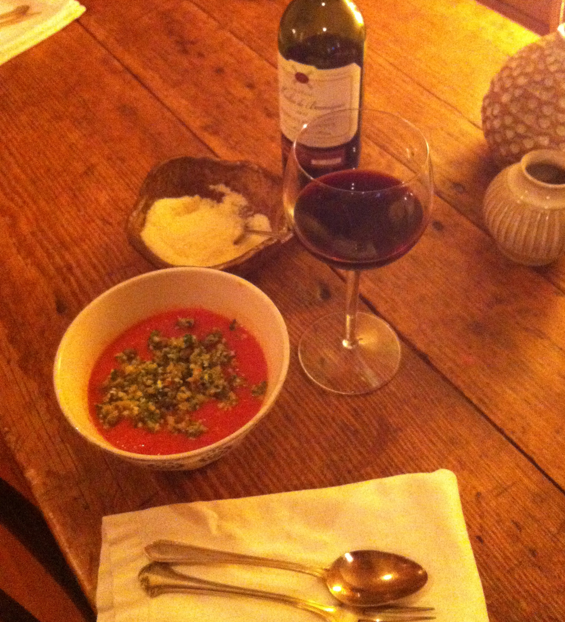 Here’s a variation to this recipe. A certain someone did not want pasta tonight. So, I reserved some of the pureed red sauce and presented a soup! I added a few spoonfuls of the kitchen sink and some parmesan on the top. Lovely. He loved it.