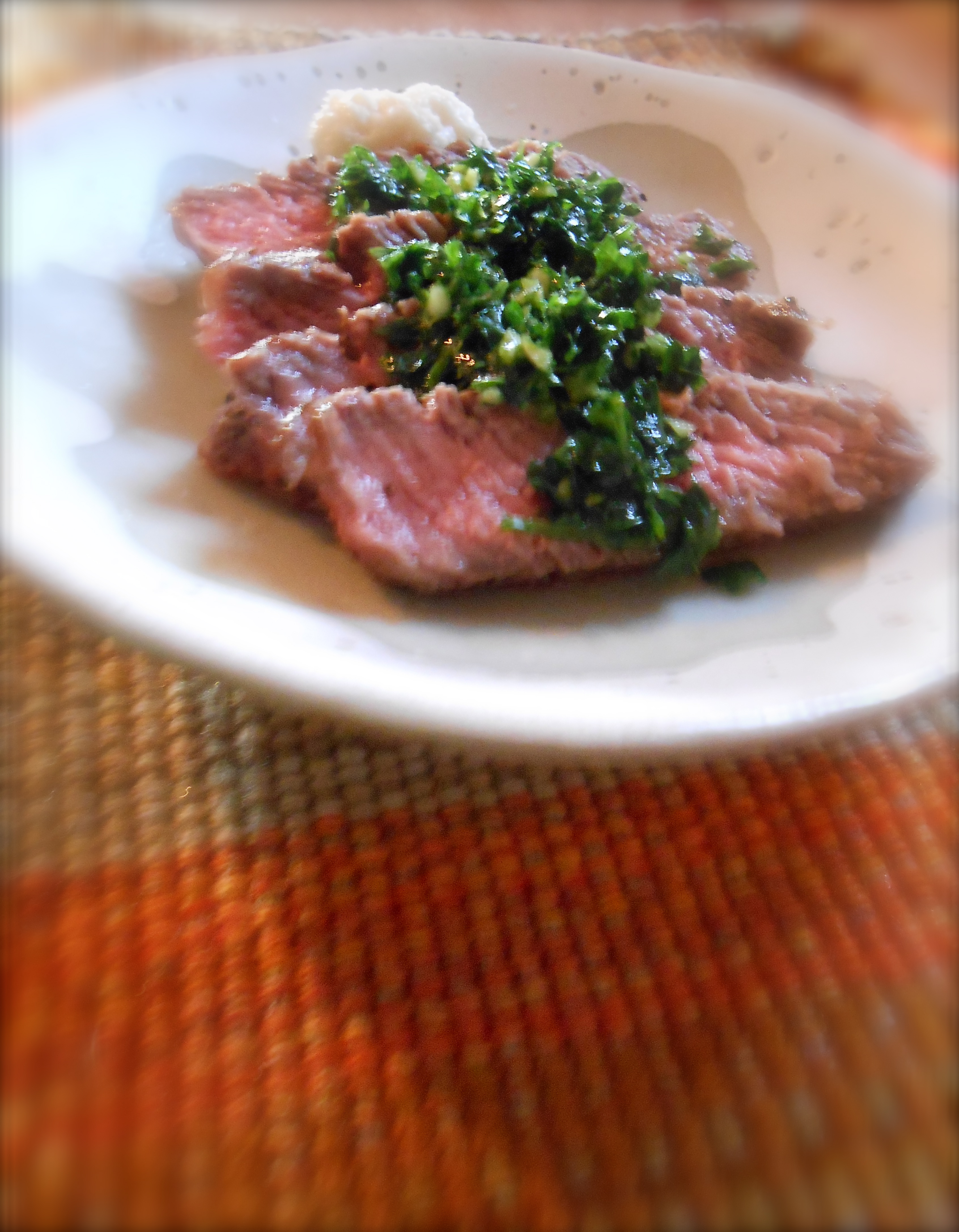 I found the parsley sauce a few summers ago in a copy of Martha Stewarts Food Everyday cookbook. I always serve this with our steaks. I call it chimichurri rather than sauce. Chimichurri is an herb condiment sauce that is considered a culinary specialty of Argentina. Typically served with grilled or roast beef. I read one definition of chimichurri being a “condiment for food” and loosely translated as “a mixture of several things in no particular order”.