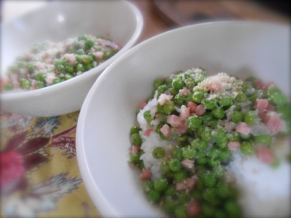 This peas and pancetta recipe came from one evening cooking with her. I have changed it a little. She actually used ham. I think it was because the town we lived in didn’t have a market for good quality proscuitto or pancetta. Bacon is another good substitution. I think if I was to use bacon I would cook it crispy before adding it to the peas. This is a very italian style pea recipe. They become thick and creamy after simmering for a good 15 minutes. Delicious served on rice. That is how we had it for dinner tonight. With a generous sprinkling of parmesan.