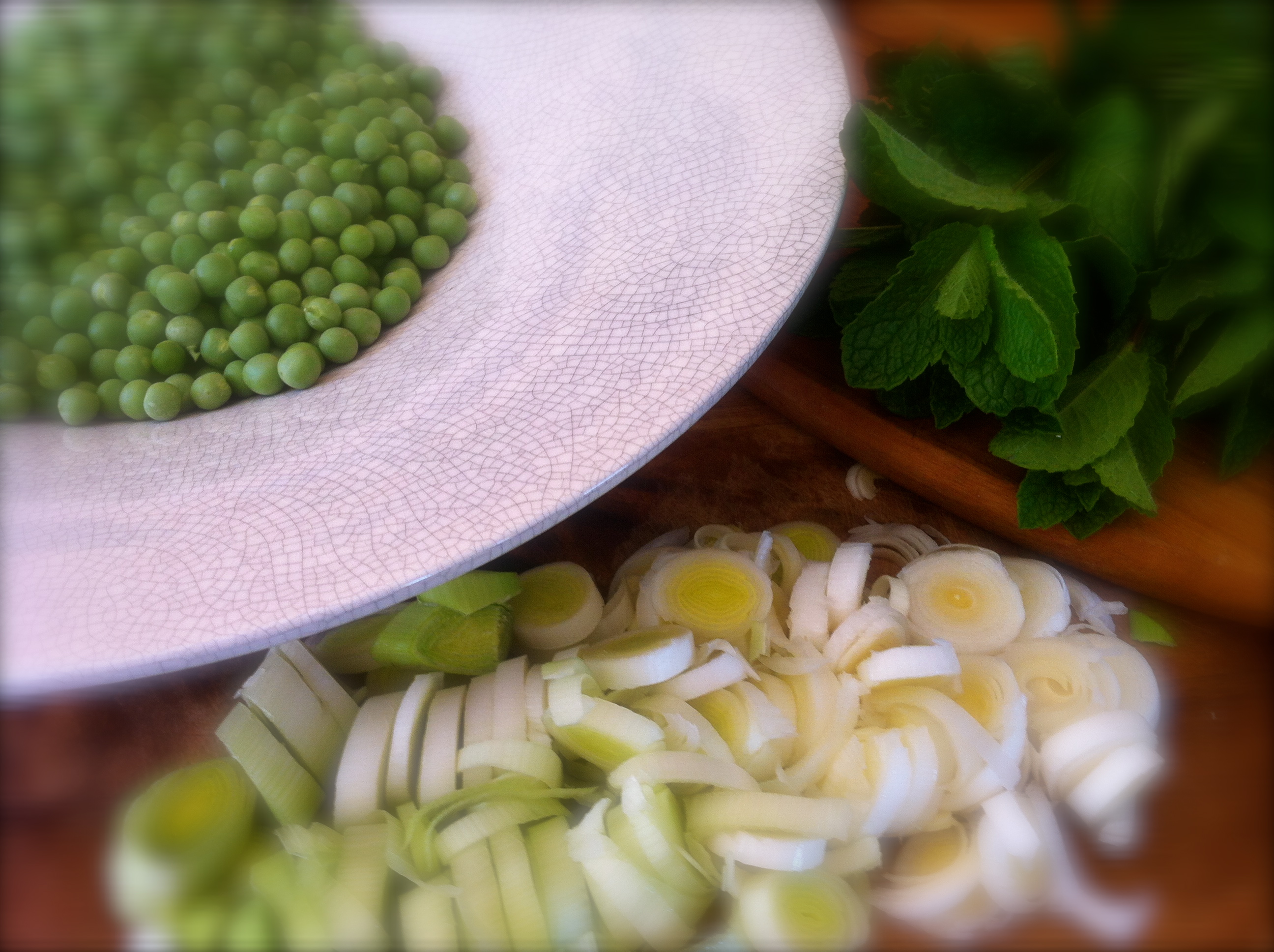Heat the butter in a heavy stock pot, cook the onion and leeks over medium heat until tender.  Add the peas and stir to coat well.  Pour in chicken or vegetable stock, increase to high heat and bring to a boil.  Cook for 5-10 minutes until peas are tender.  If you are using frozen peas they will take less time to cook.  Turn the heat off and add the mint, salt and pepper.