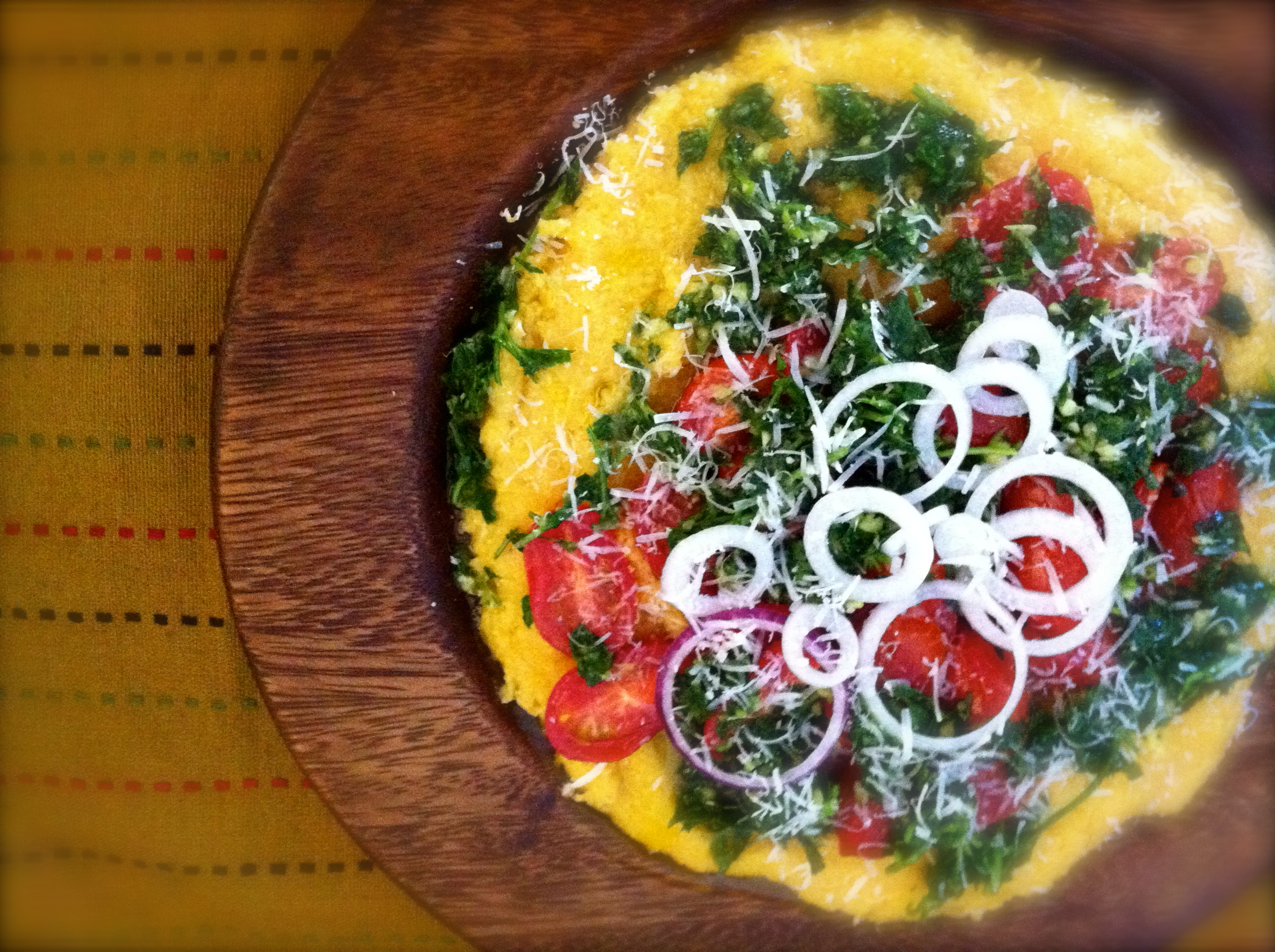 My first polenta dinner was quite an experience.   I had a friend over who wanted to prepare a classic dish he had as a child growing up in Italy.  In my friend’s opinion the only way polenta should be eaten is with a rich meat sauce.  His plan was to prepare Polenta with Chicken Livers.  Once the polenta was cooked it was poured directly onto my dining table and topped with the chicken liver sauce.  Although I was very impressed by the presentation, I do not have the palate for chicken livers so I kept trying to scrape the edges where the sauce didn’t touch.  Even without the sauce, I was captivated by the creamy texture and tiny bits of corn meal similar to the grits my mom would prepare.