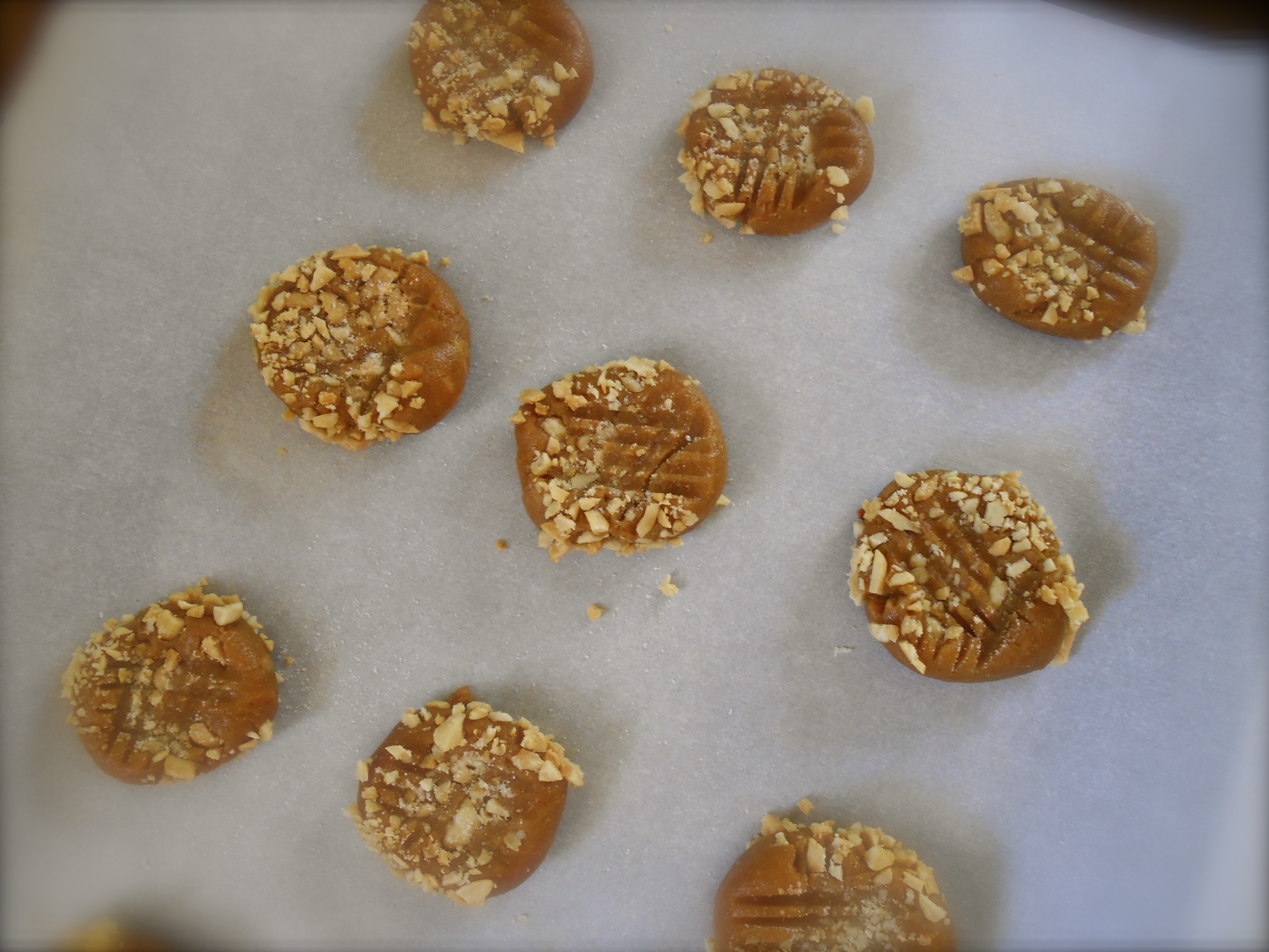 Preheat oven 350°.  Mix all ingredients in a medium size bowl.   Roll little balls of dough in the palms of your hand, then roll along your crushed peanuts.  Place on a parchment lined baking sheet.  Dip a fork into sugar and “stamp” each ball to flatten into a cookie shape.  Bake for 12 minutes.