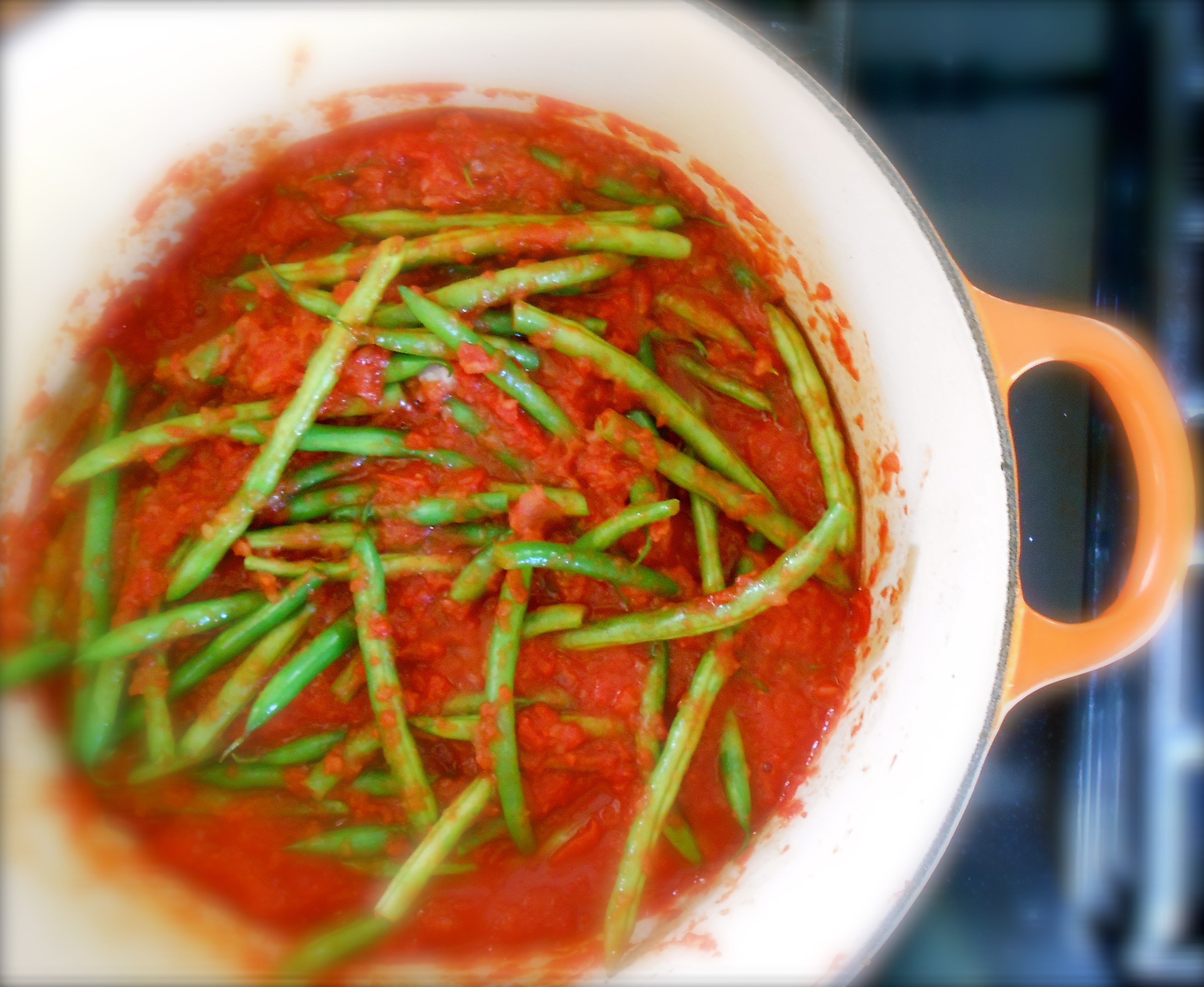 Normally we eat green beans steamed just enough for them to turn a stunning green and yet still a little crisp. After a quick steam bath we toss them in olive oil and salt and savor every single one of them. However, green beans are delightful after stewing in a flavorful tomato sauce for an hour or so. They become meltingly tender, sweet, silky and stew like. Although my tiny recipe book recommends serving these cold, these beans are best if left in the pot overnight in the refrigerator and brought to room temperature before serving.