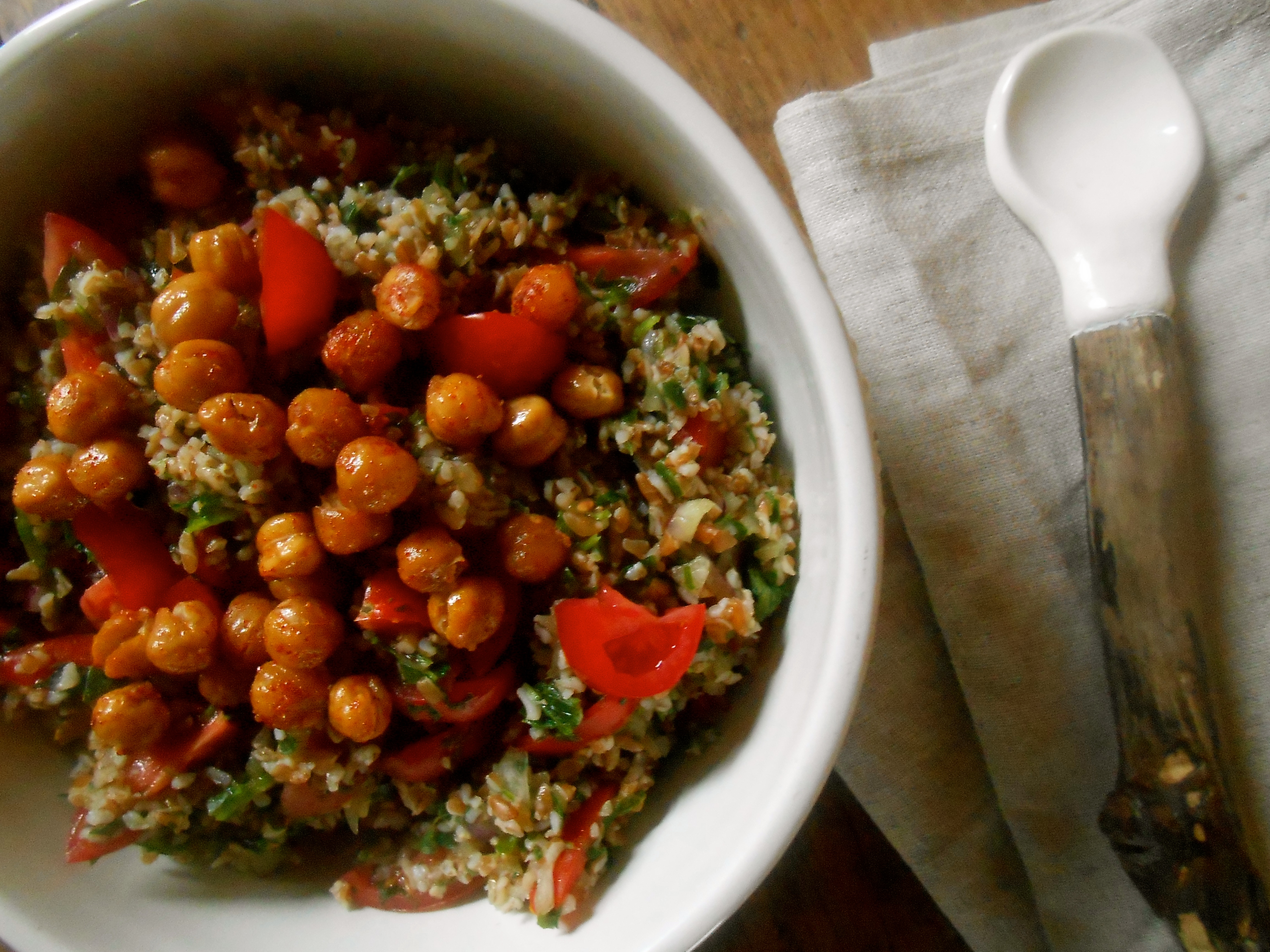 The other day I was reading a post from lucysfriendlyfoods and when I saw her tabbouleh post I had that glorious feeling spring is here.  We may not be there yet, but why not make a nice fresh herbal salad with little tomatoes and roasted chickpeas.  Yes, the same roasted chickpeas I posted just the other day.  My understanding of tabbouleh is the cracked wheat (bulgur) is meant to be more of a garnish and the herbs play a larger role as the main ingredient.  Tabbouleh should be considered a green herbal salad with a touch of cracked wheat.  Thank you lucylox for  inspiring a pre-spring salad!    Now, I’m off to Fiesta Friday, as usual a little late.  See you there!  And thank you for the spoon Elena!