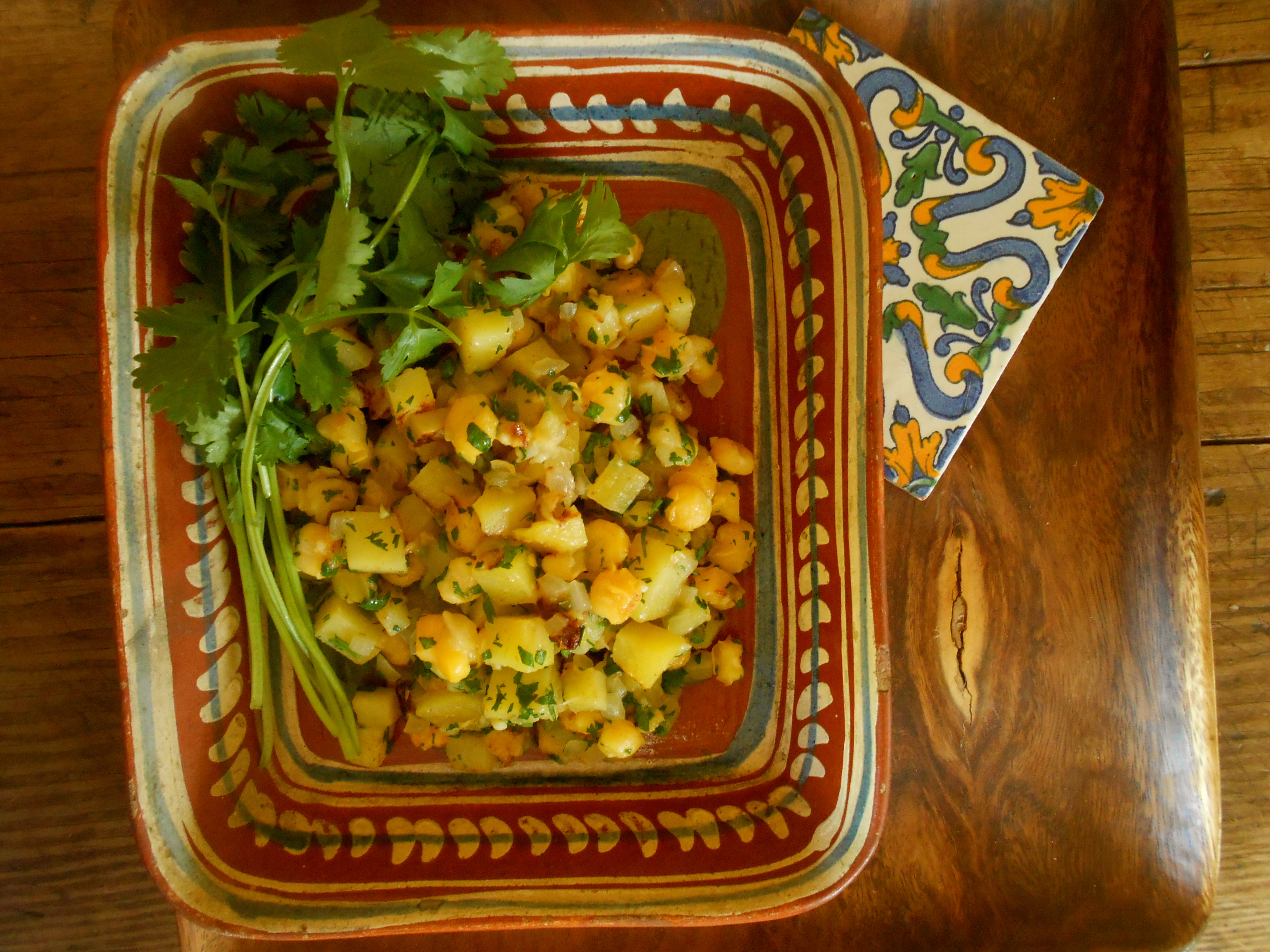 Heat olive oil in a large skillet over medium high heat.  Add garlic and cook a one minute until aromatic.  Add onions, jalapeño pepper and potatoes and toss around with a spatula until well combined.  Season with salt and cook for 20 minutes or until potatoes are tender.  Add hominy and cook for 10 minutes.  Add fresh cilantro, a squeeze of lime and serve.