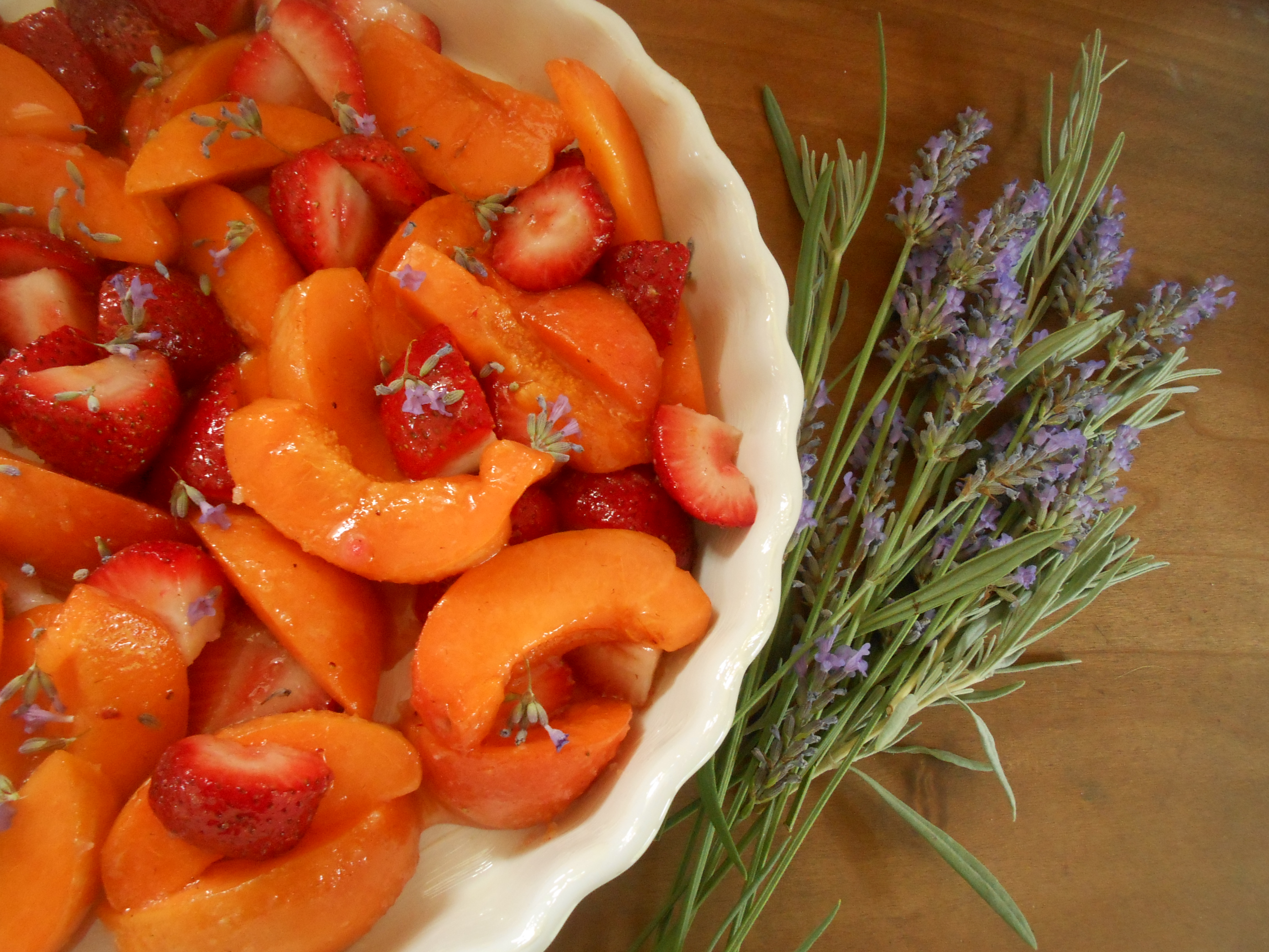 Am I ever glad it is crumble season!  A simple crumble is the essence of summer.  My favorite dessert involves baked fruit with either crust or a crumbly mixture of oats, nuts and butter.  And here we have it.  A homey apricot strawberry crumble, a little bit tart, slightly sweet, a crispy toasted topping and with a subtle hint of lavender.