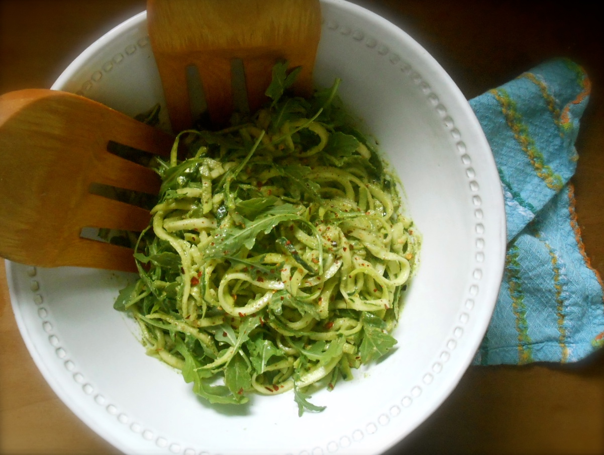 If you don’t own a food processor finely chop parsley, garlic and pecans. Combine with olive oil, parmesan and chili flakes. Toss zucchini, arugula and pesto in a large bowl. Taste and add a little more parmesan and / or salt to your liking.