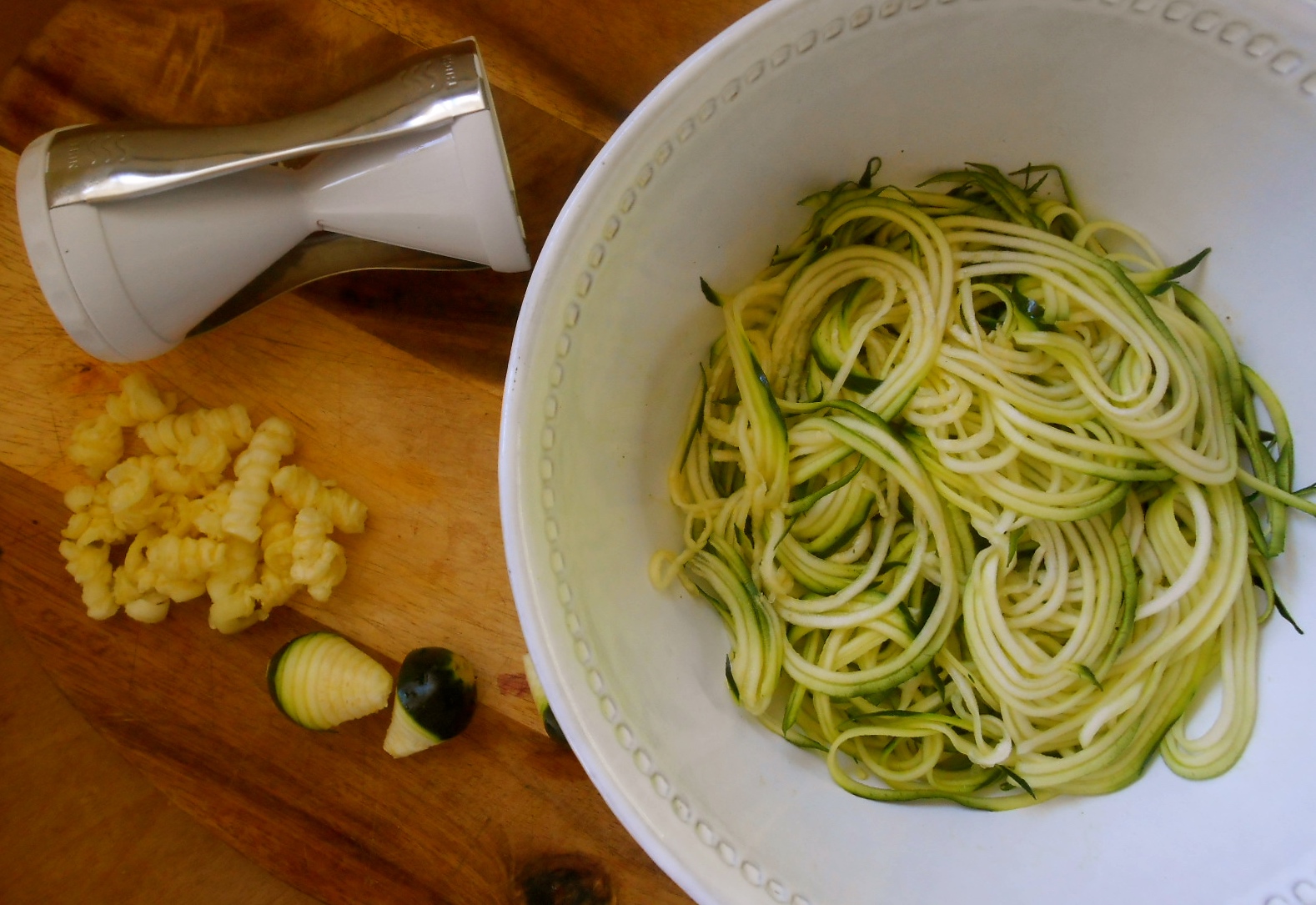 I am not a kitchen gadget & tool person. If you can believe it I don’t own a blender, food processor (it stopped working), Kitchenmaid mixer, slow cooker or microwave (well, we have one but it’s in the basement). I guess you could call it an ill equipped kitchen, but we get along just fine. However, this gadget…the spiralizer is something I have grown very fond of. It creates beautiful strings of vegetables. You can even twirl your freshly spiraled vegetables around your fork and have the same wonderful sensation that only spaghetti can satisfy. It’s a hot item and most likely considered a trend, but I am convinced it is a nice alternative to enjoy a bowl full of delicious healthy noodle-like textured vegetables similar to semolina pasta. If you are unable to obtain a spiralizer you can achieve the same wonderful pasta like “noodle” by using a vegetable peeler and shaving your zucchini into thin ribbony Pappardelle.
