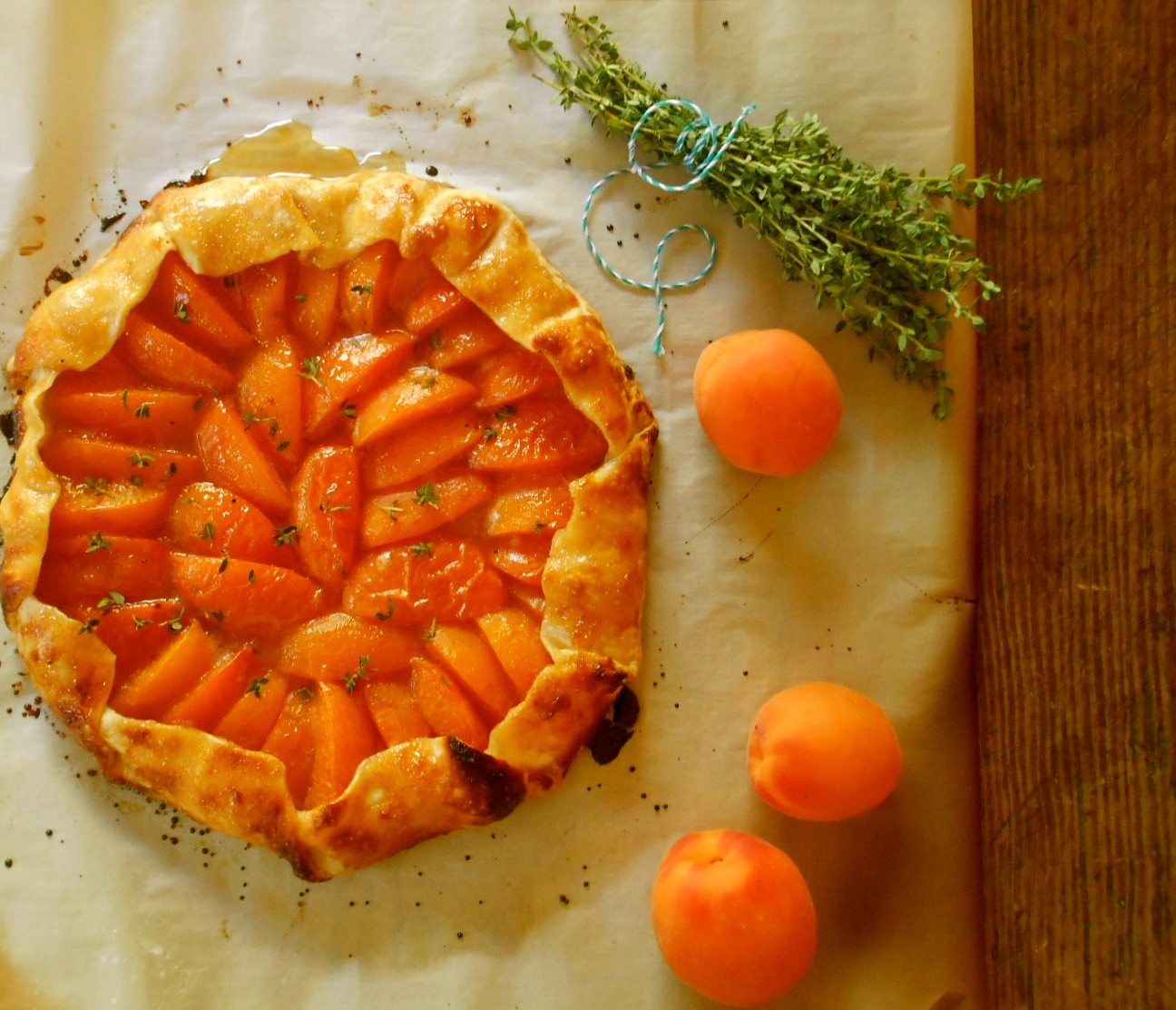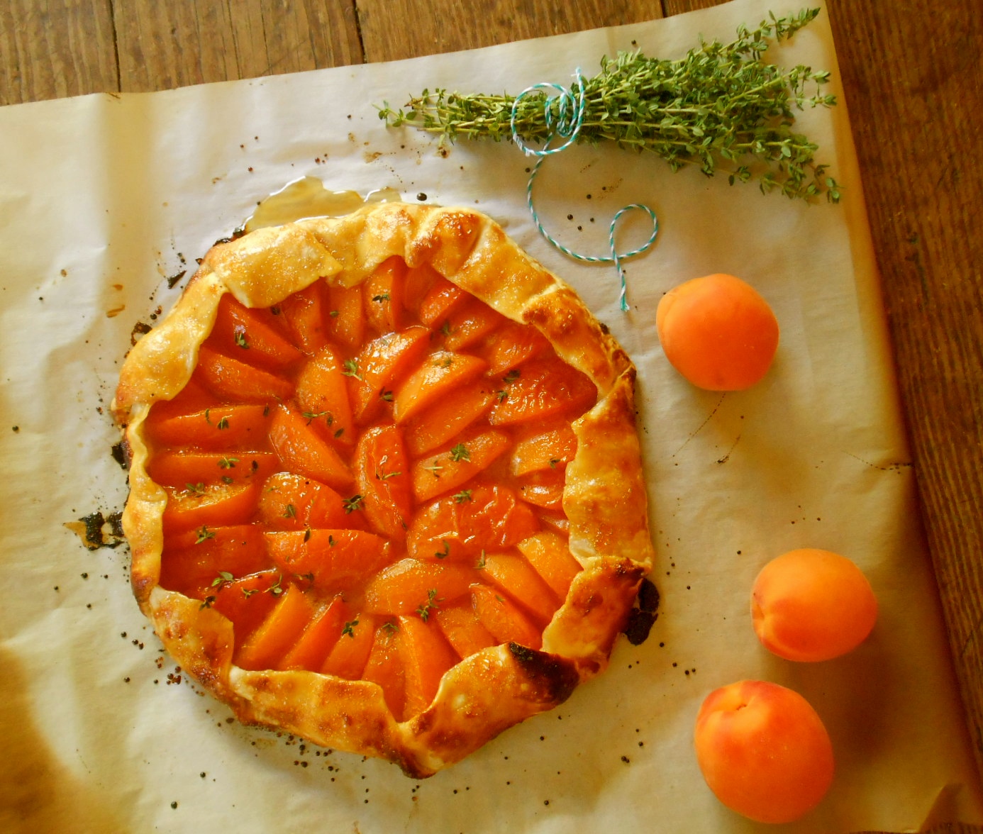 With a nice bunch of apricots on hand I decided to bake this tangy, scarcely sweet galette for dessert. I have a weakness for galettes. I love the ease of preparation and the rustic look with it’s imperfect folds and uneven edges. And I’ve been a little obsessed with adding herbs to baked goods and desserts. Thyme pairs quite nicely with apricots in this charming galette.