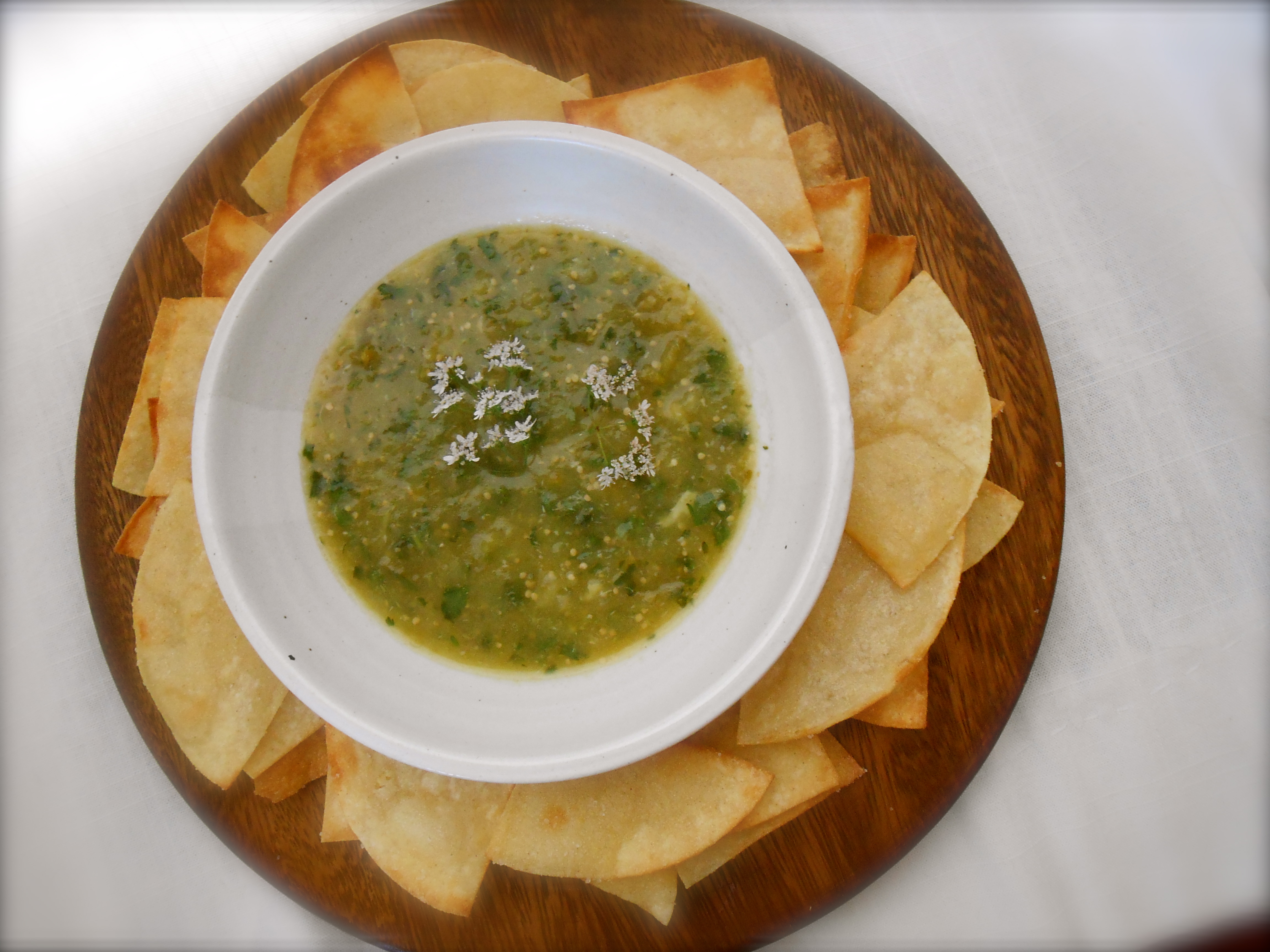 I learned how to make tomatillo salsa when I was a community supported agriculture (CSA) member and receiving weekly boxes of fresh fruits and vegetable from a local farm here in the Pacific Northwest. I remember discovering a large bag of tomatillos in my box and not knowing what to do with them. I was familiar with salsa verde and set out to find a recipe. By definition a tomatillo is a small green fruit, similar to a tomato, with a paper-like husk. They are very tart in flavor and aside from salsa verde I have not experimented with them. This is a wonderful salsa served warm with freshly made tortilla chips.