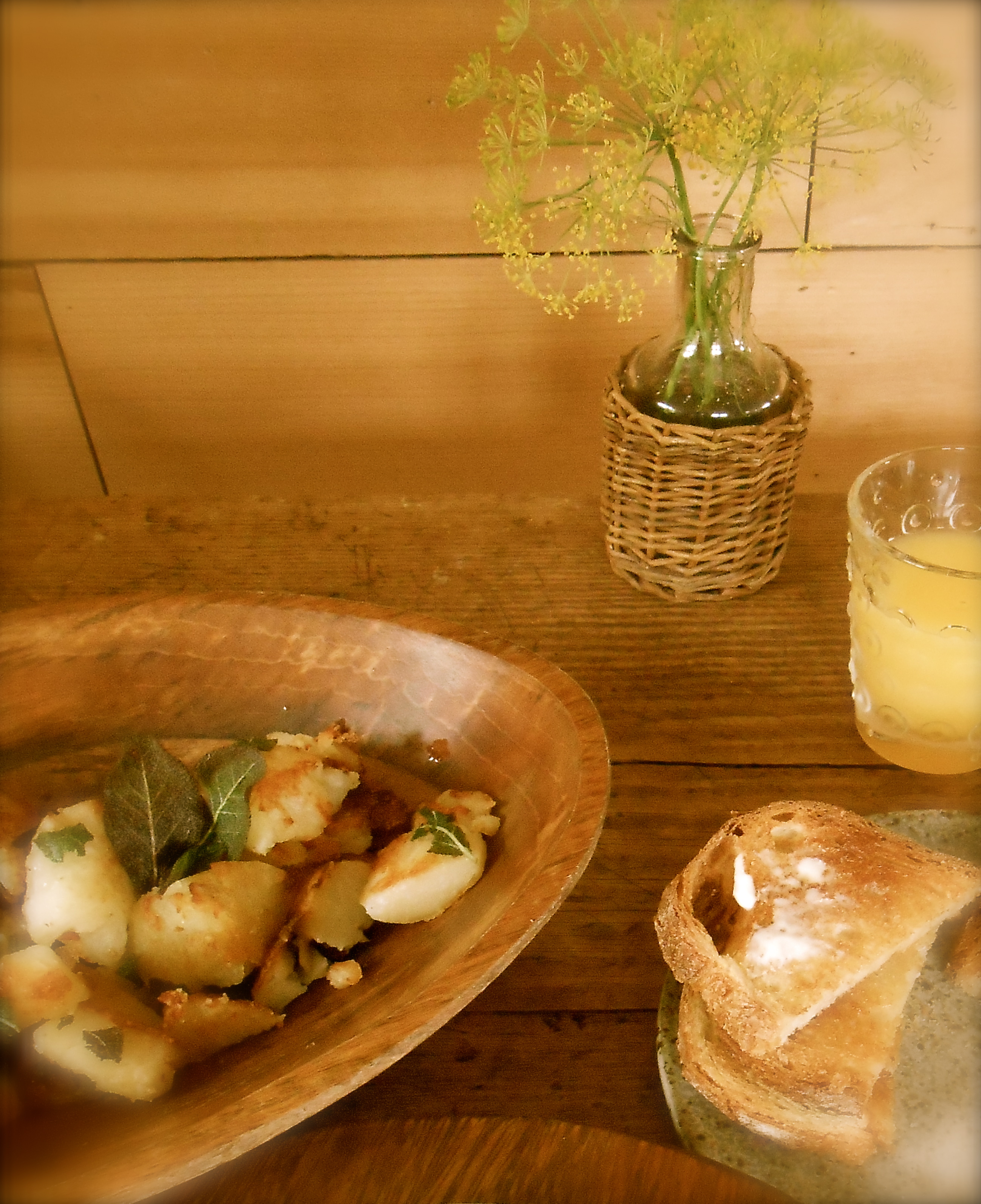 Gather as many large fresh sage leaves as you can. Rinse and pat them dry. Pour enough olive oil to cover the bottom of non stick skillet and turn the heat to medium high. Drop the leaves in and allow to sizzle until brown, turn them over with wooden tongs, sizzle and brown the other side. When crispy remove them from the skillet onto paper towels and lightly salt each one.