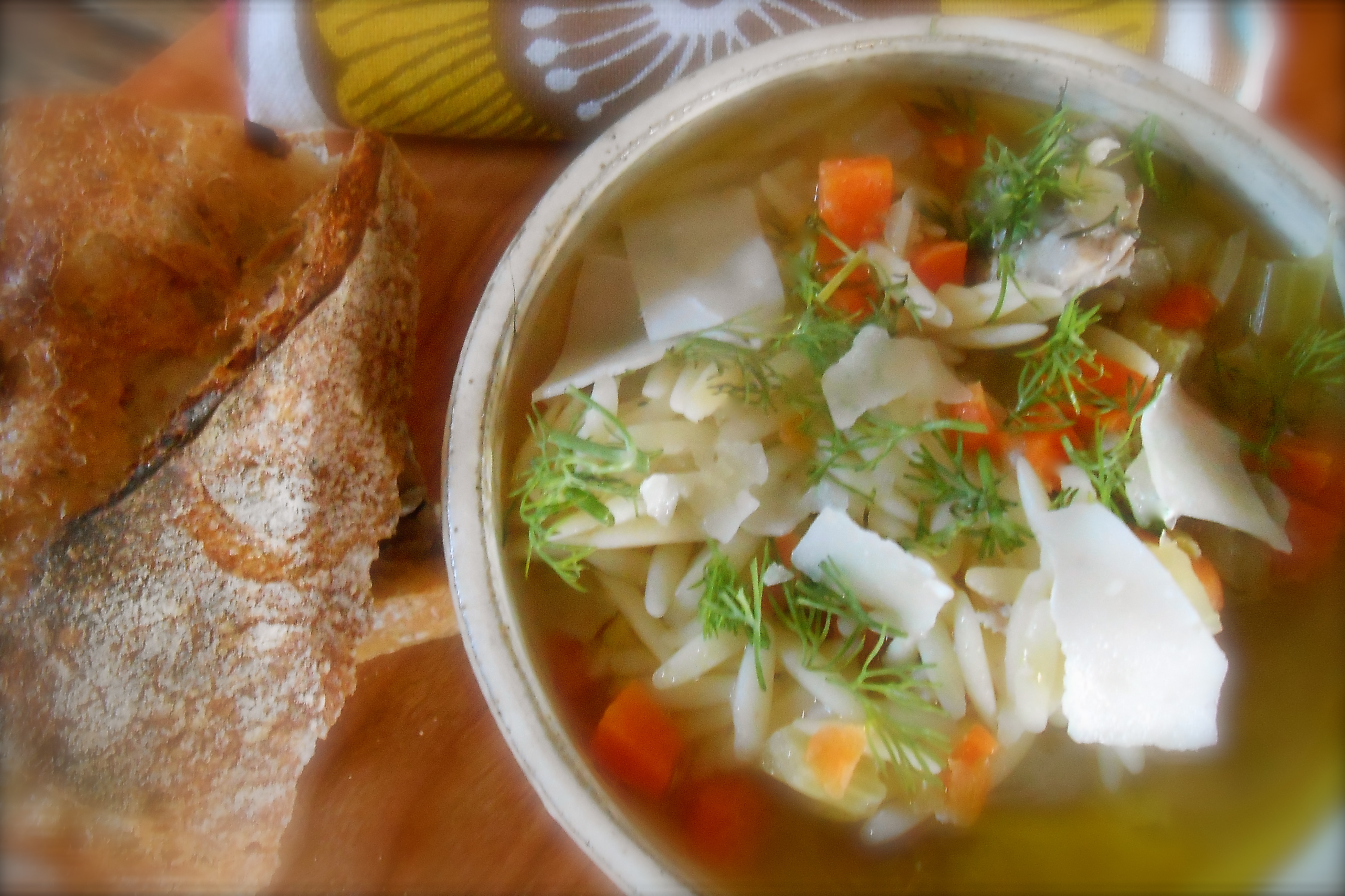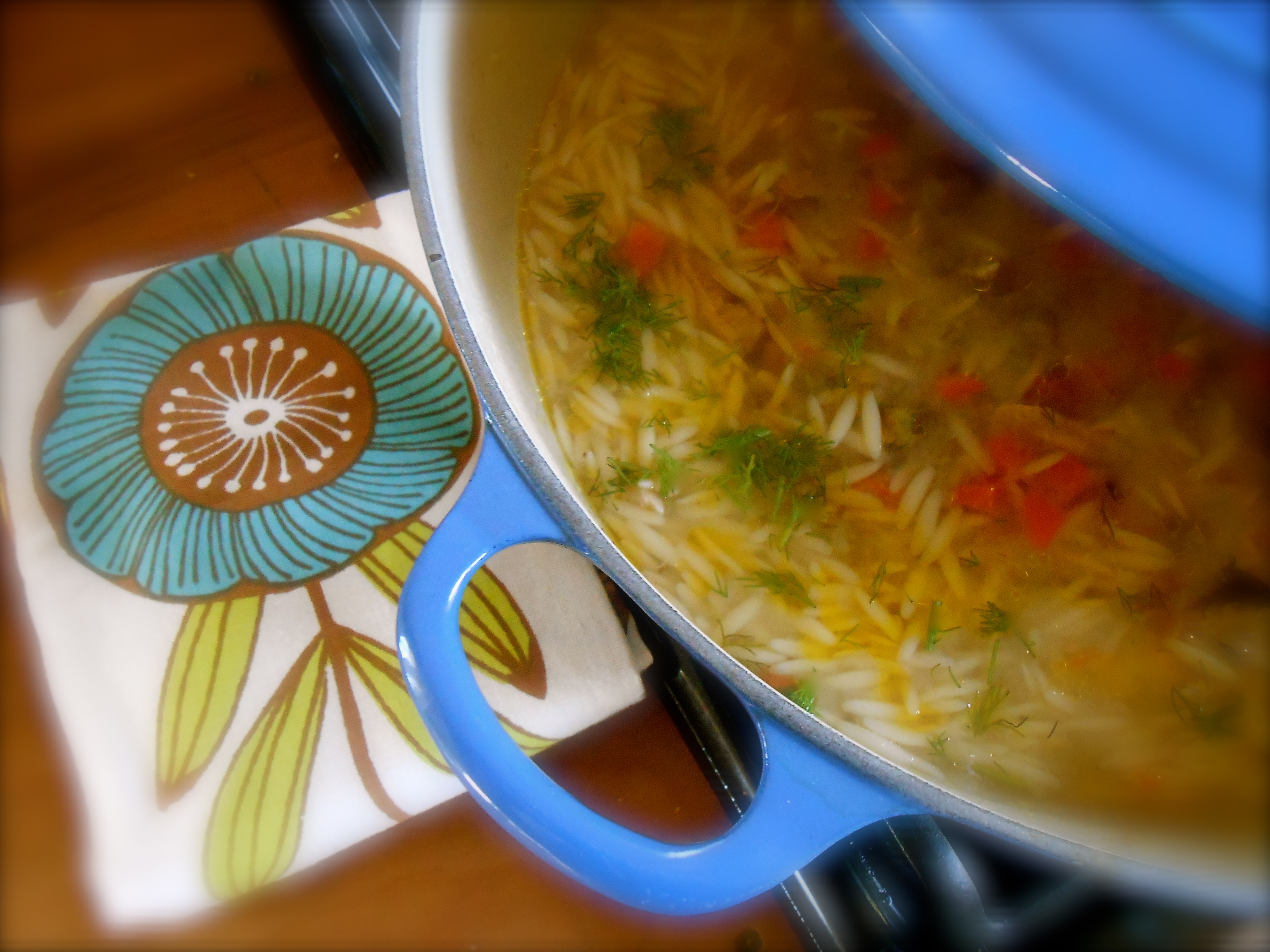 Meanwhile, return soup to a boil. Add orzo and cook for 15-20 minutes. Ladle into serving bowls. Top with fresh dill, a drizzle of olive oil and a few squeezes of lemon.