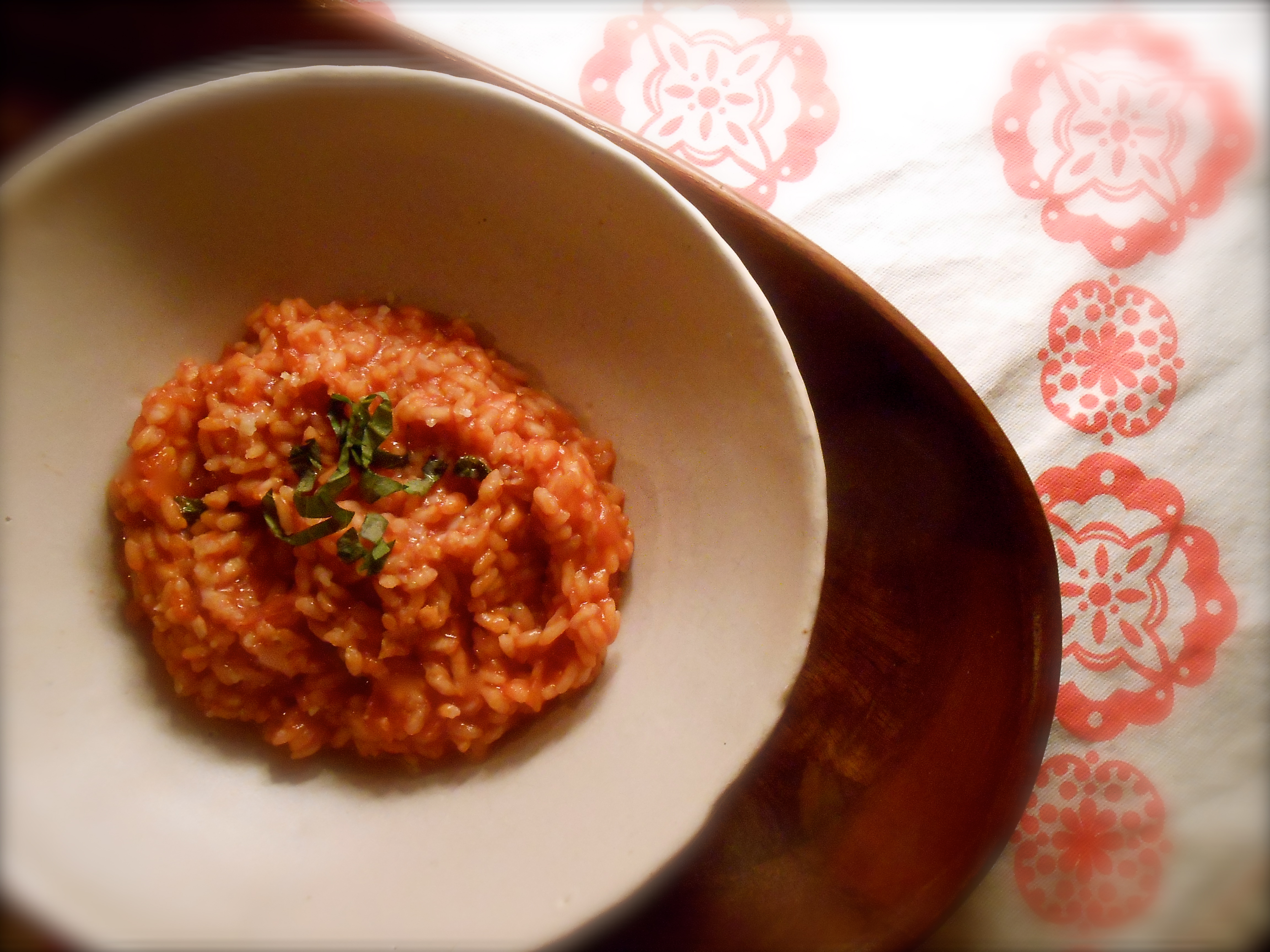 Heat the olive oil in a wide heavy bottomed pot. Sauté the onion and garlic over low-medium heat for 5 minutes, or until lightly golden. Stir in the chile flakes and risotto, and cook for another minute. Add half the tomato purée, half the basil and 1 1/2 cups of the hot broth. Reduce the heat to low and simmer 10 minutes. stirring now and then. Add the rest of the tomato purée and the remaining broth, and simmer for 10 minutes, or until the risotto is cooked (if it needs another few minutes or a little more liquid, just use hot water). Tessa recommends you remove the garlic cloves and throw them away. We keep them in and eat them! Stir in the Parmensan and remaining basil. Serve drizzled with olive oil and a good grating of black pepper and pass around the extra Parmesan.