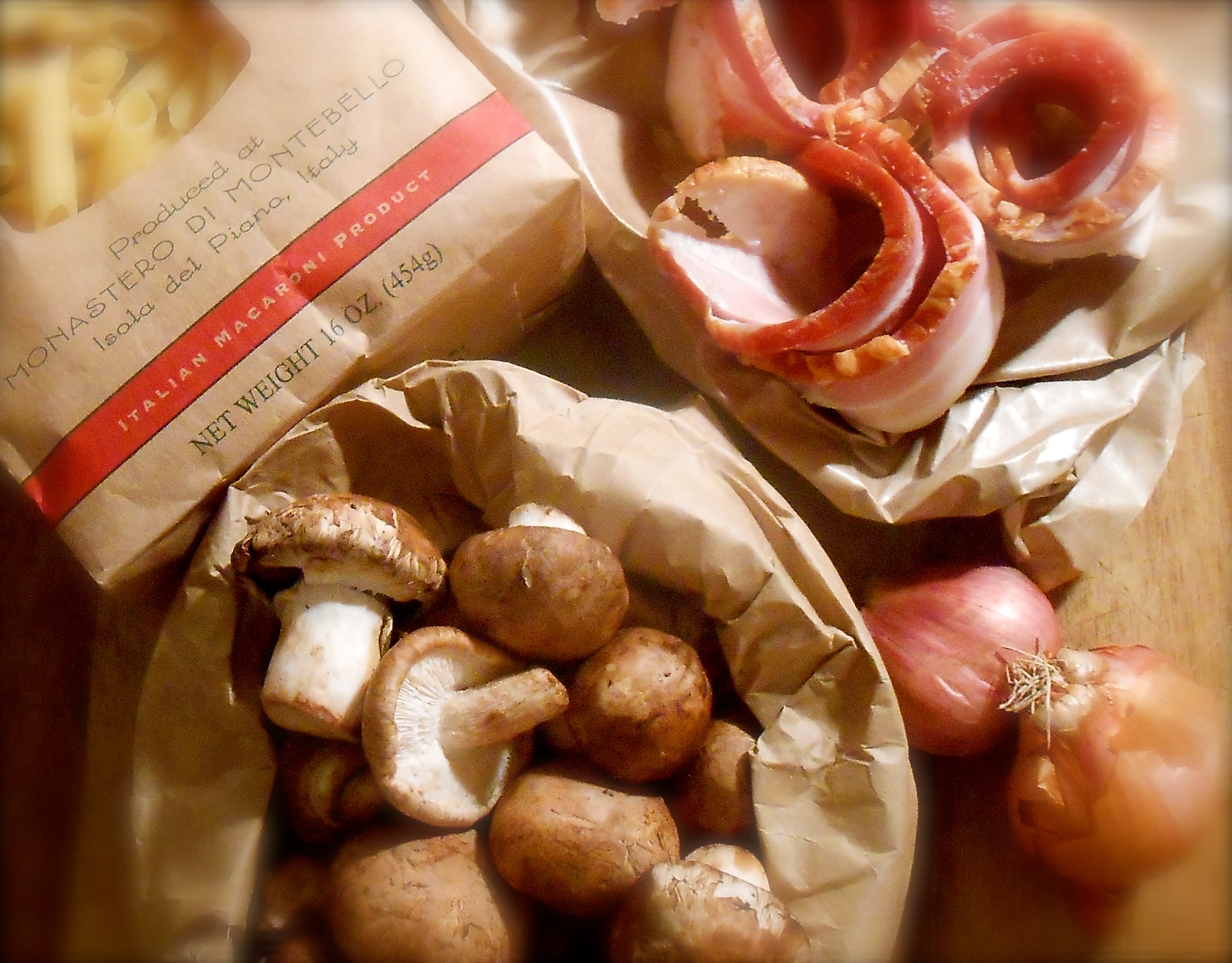 Penne with bacon and cream. This is what we had for dinner the other night instead of macaroni and cheese. On a freezing late afternoon my teenage son mentioned how “cozy” it was in the house and he wanted a bowl of macaroni and cheese. We checked the refrigerator and did not have enough of the right type of cheese. However, what we did find was a bag of cremini mushrooms, bacon and some heavy whipping cream. I know, it’s the New Year and we are suppose to be eating light. How do you tell that to a 15 year old young man who eats constantly?! He agreed with the prospect of this combination and I was happily pulling the pots out as well as the chopping block.