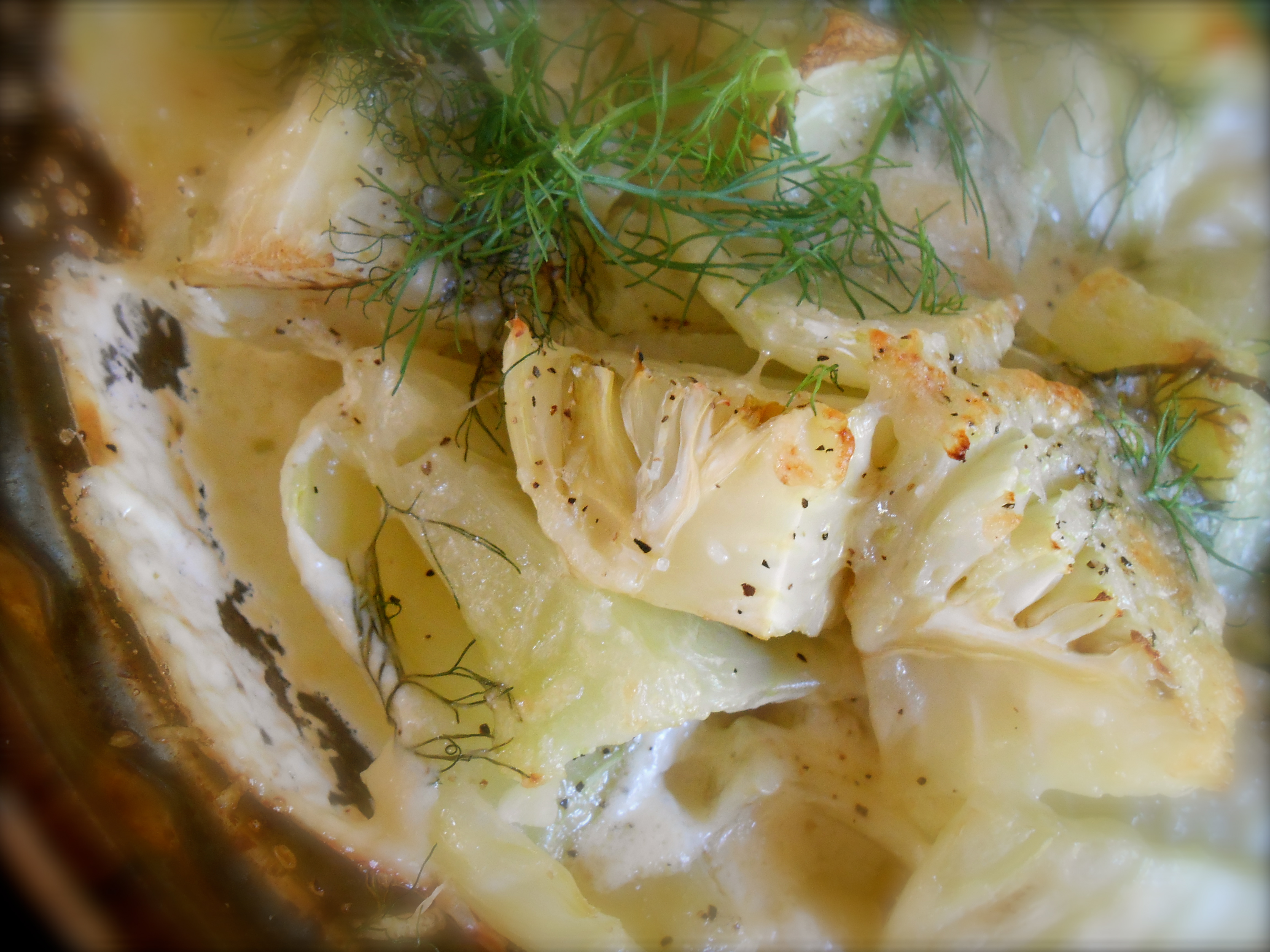 Preheat the oven to 400°. Trim the fennel tops and save any feathery fronds for later. Quarter the bulbs and cook in lightly salted boiling water for 5 minutes until tender. Drain well and place the fennel in a buttered gratin dish. Sprinkle the reserved fronds on top. Season with salt and pepper, pour on the cream and sprinkle with cheeses. Bake for 20 minutes. I sprinkled a few uncooked fronds on top after baking.