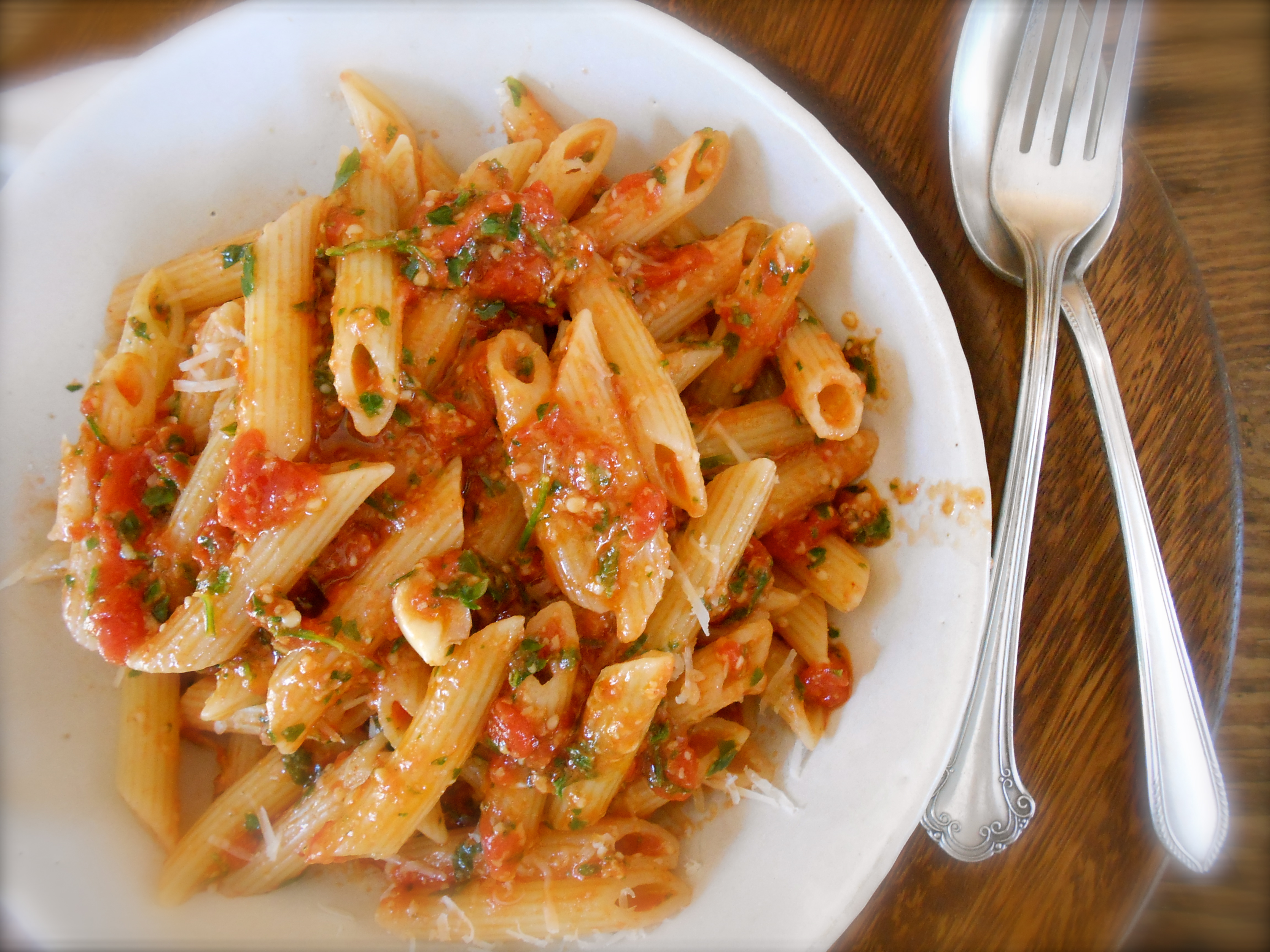 We all have a “go to” dish we have perfected to our liking over time and repetition. Perhaps if you have been checking in with this blog you would guess mine would involve pasta. Cottage Grove House is still very new and there is already sixteen pasta recipes posted. Today’s recipe is my “go to” pasta sauce. When it seems as though there is nothing to eat or prepare in the kitchen I always find some parsley in the crisper (or in this occasion the garden) and a large can of tomatoes in the pantry, perfect to make both pesto and tomato sauce pasta.