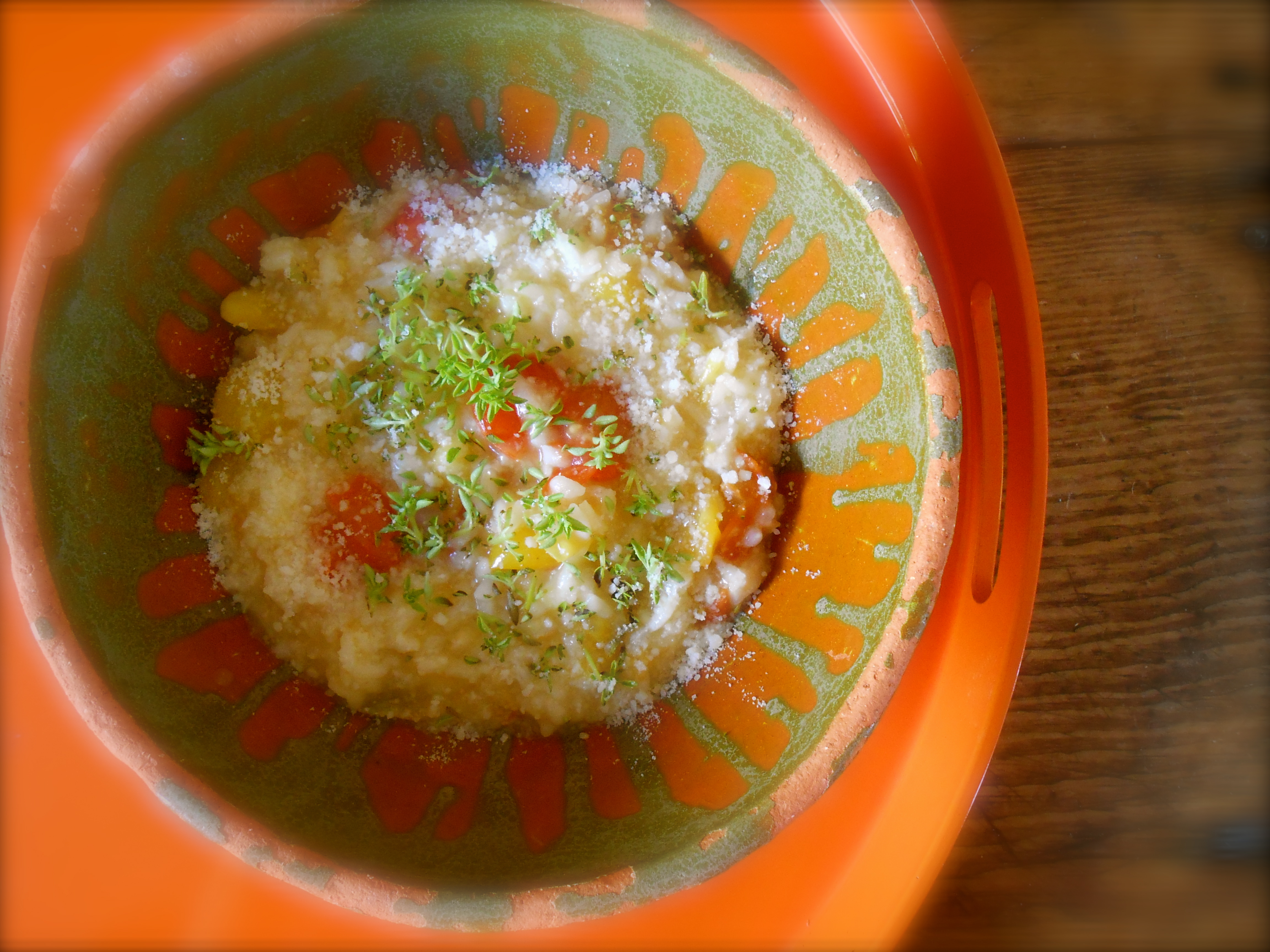 I brought in a fair amount of Sun Gold’s and a few Sweet 100’s today and decided to make a risotto for dinner. This was sensational. The tomatoes along with the red wine vinegar gave the dish a subtle tang and the Grana Padano cheese was a perfect match for bringing out the flavor and adding a bit of creaminess to it’s texture. A very lovely Tuesday night dinner.
