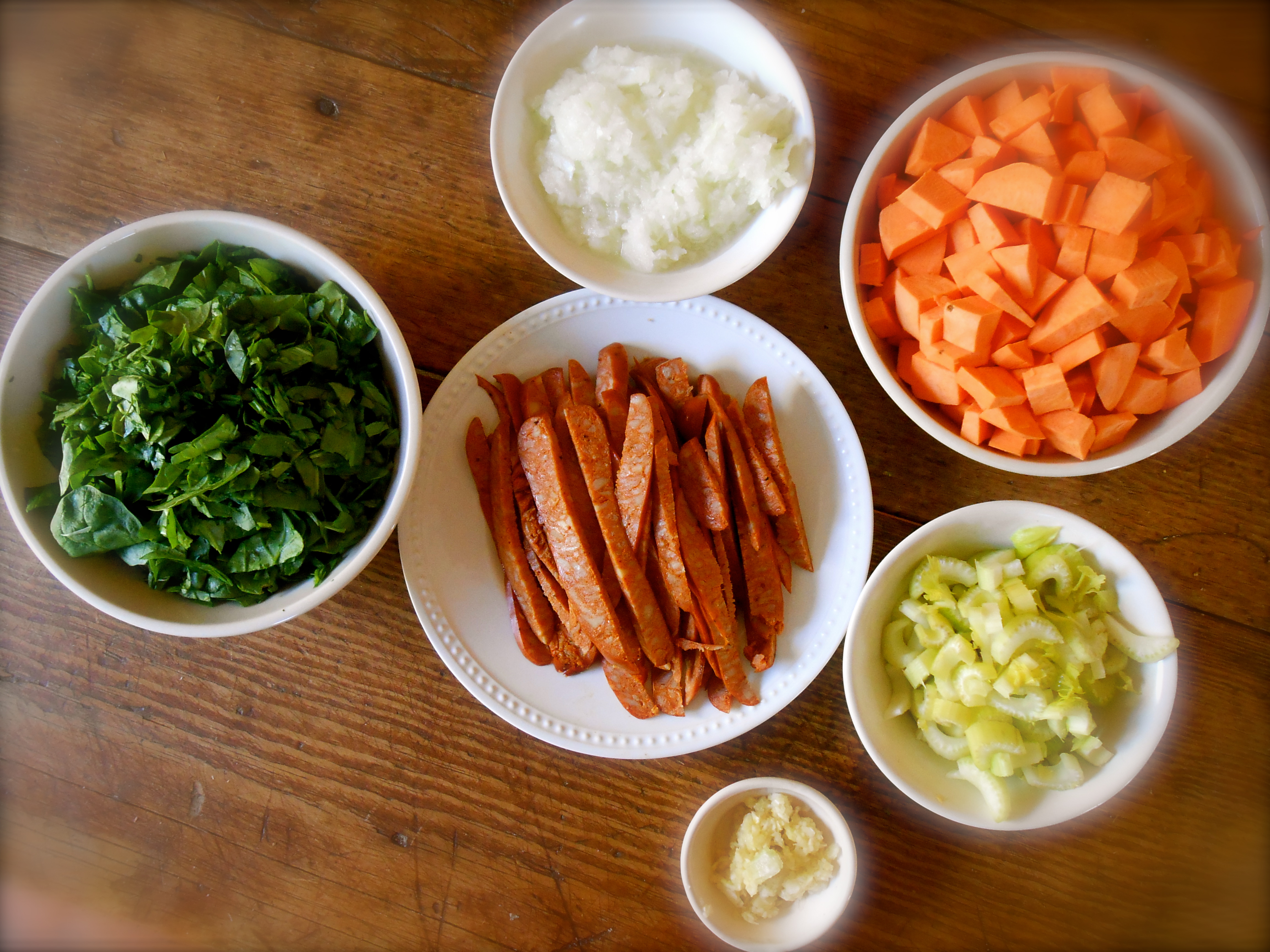 I used a very spicy sausage this time and it was delicious. You may tone it down a bit if your palate doesn’t handle spicy too well. I couldn’t remember if I made it with sweet potatoes or yams, so I chose the latter, however, I think sweet potatoes would be a nice offset to the spicy sausage. Knowing a roux is always made with butter, I decided to try to achieve the same results using olive oil, and it worked! If you would like to use butter instead of olive oil, omit the olive oil and use a 1/2 cup (full stick) of butter. Final note, the recipe calls for cream and I substituted whole milk and it was perfect. This is a one pot dinner.