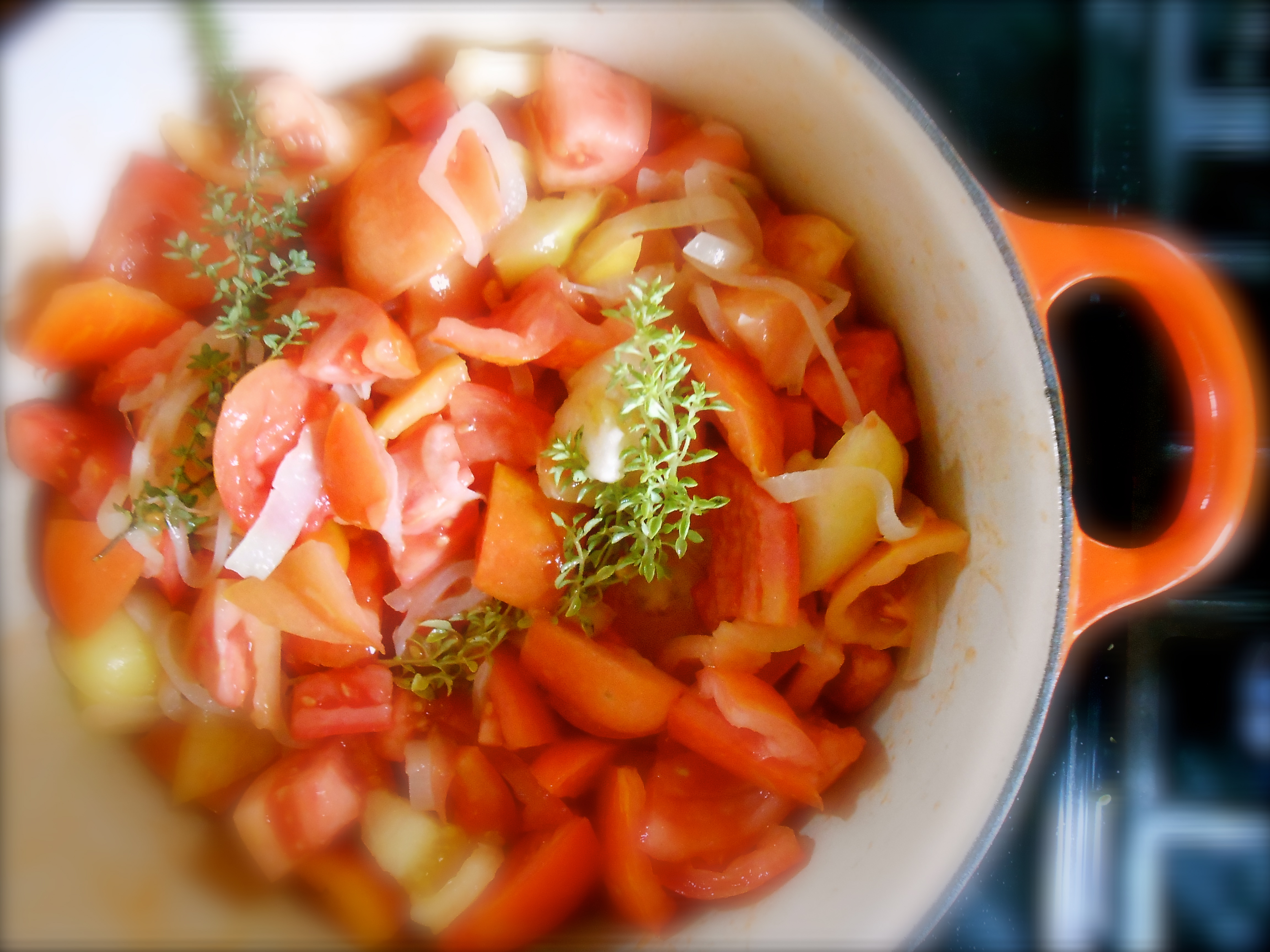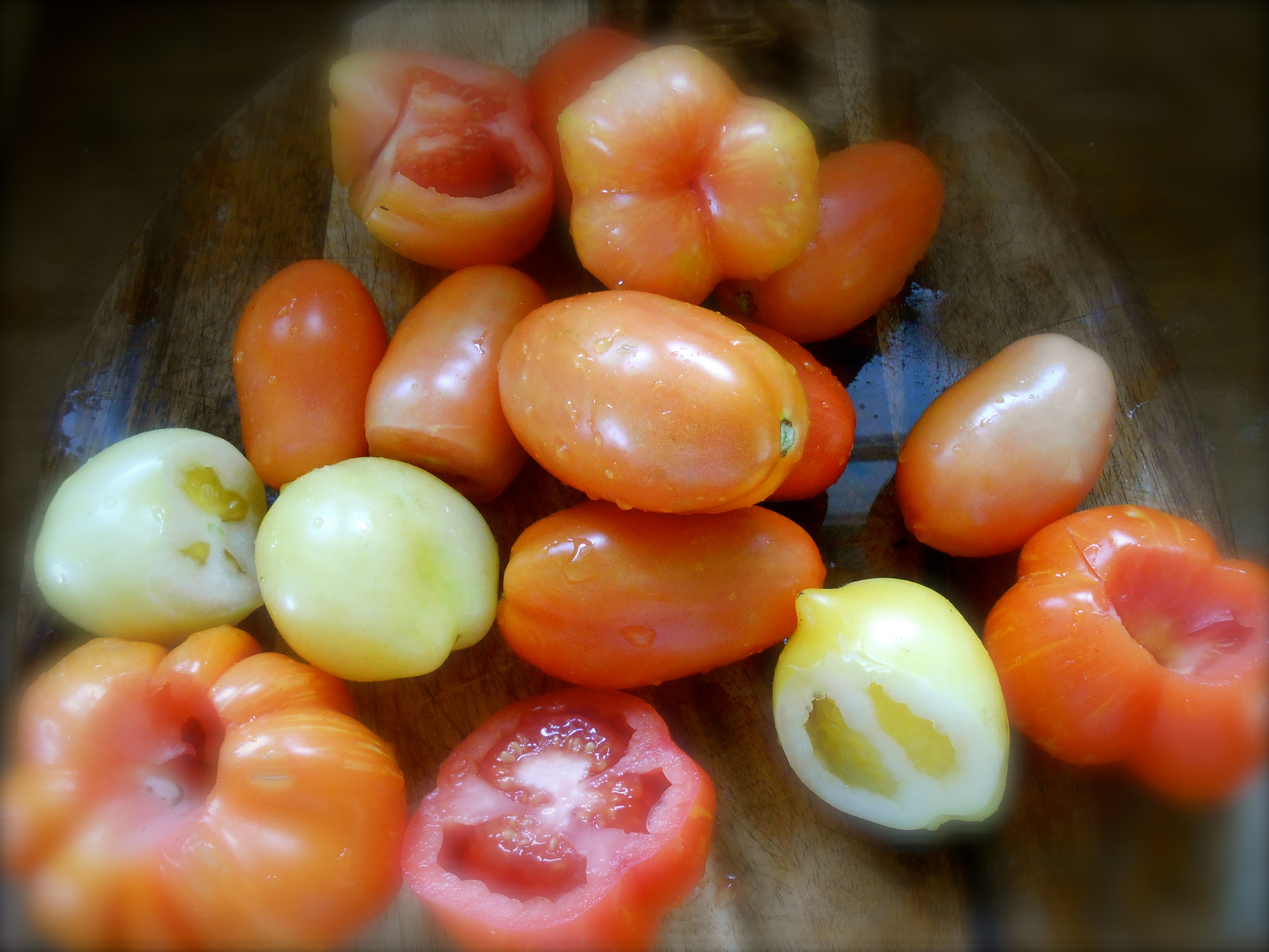 For this particular recipe a medley of tomatoes straight from the vine went into this garden tomato soup. A very sweet and firm fleshed tomato called “Plum Lemon”, which is a russian yellow tomato that looks like a lemon! An heirloom striped tomato which looks like a bell pepper and also harvested were several plum tomatoes to add to the mix. Straight from the vine and into the soup pot.