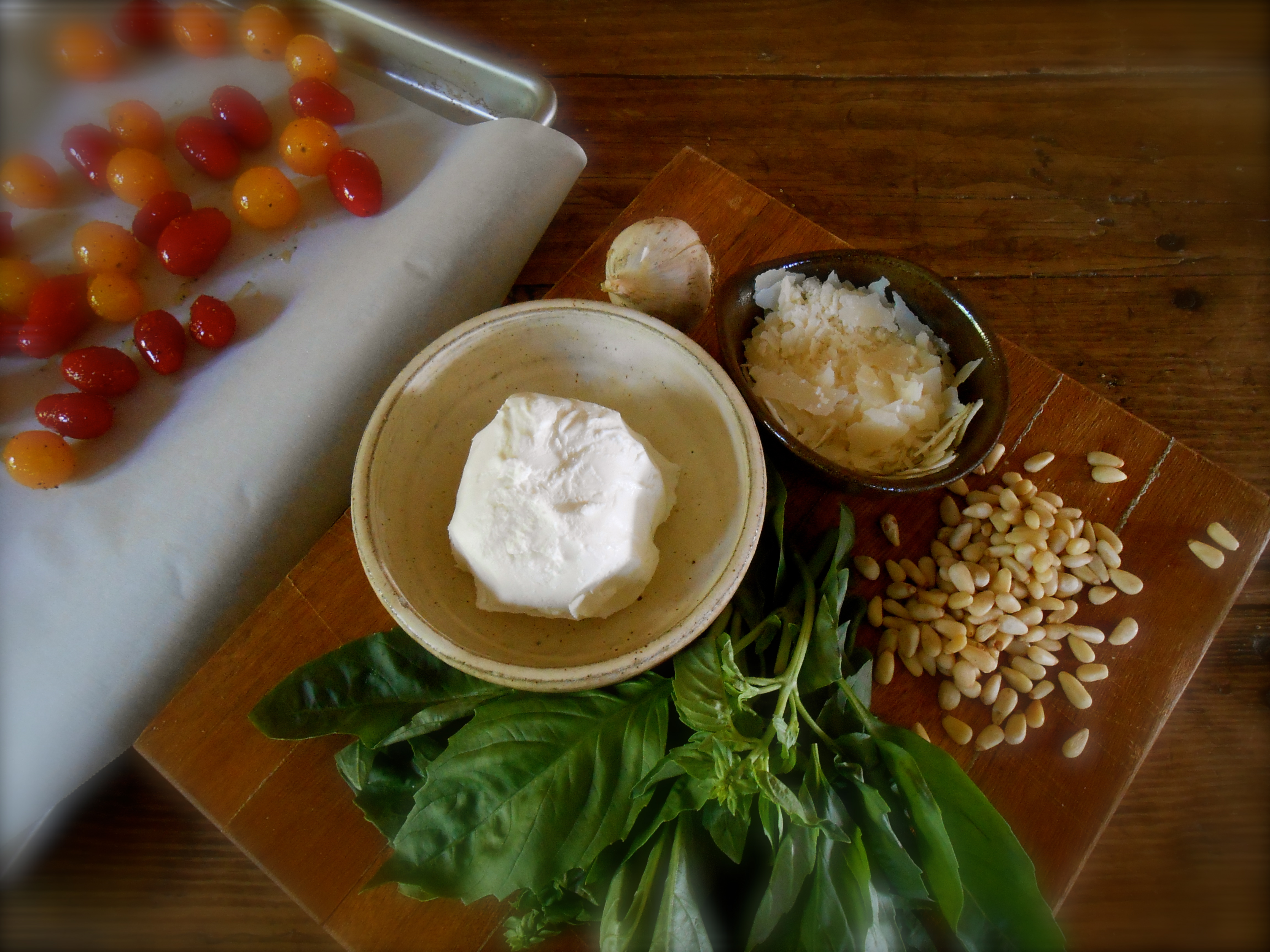 Put a large pot of water on the stove over high heat. Prepare tomatoes for roasting and make the pesto while you are waiting for the water to boil.