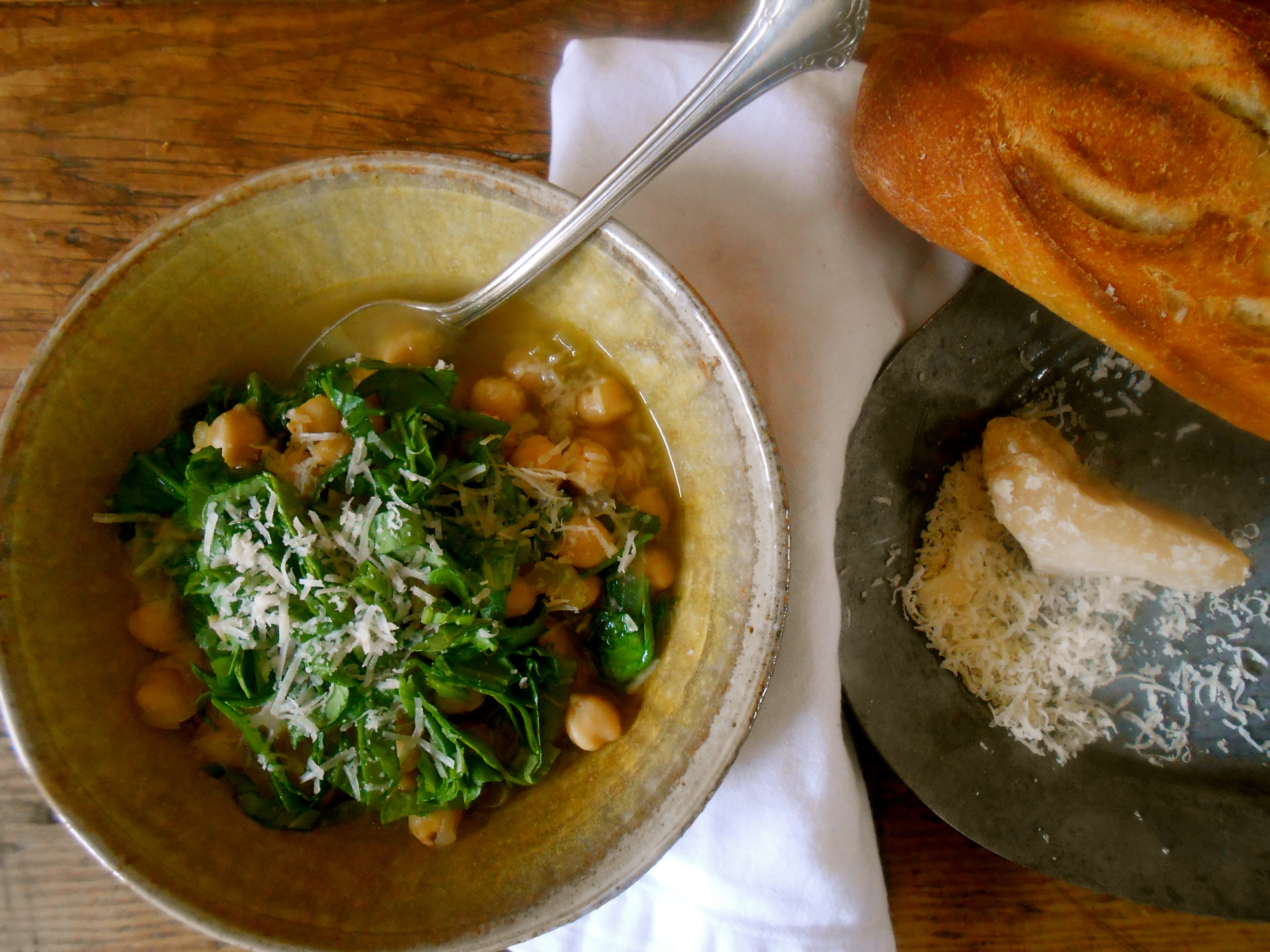 It is windy, cold and raining buckets and as you can imagine a spicy chickpea stew is perfect for this type of weather. Each spoonful unites the earthy nutty sweetness of chickpeas and spunky soulful taste of mustard greens, heat from the chile’s and rounding out the whole, a subtle undertone of rosemary. This stew is a breeze to make and keeps well for several days in the refrigerator. I suppose in the spirit of beans ‘n greens, swapping the ingredients and using white beans, kale. collard greens or chard would be just as effective in producing a delicious cold night vegetarian stew.